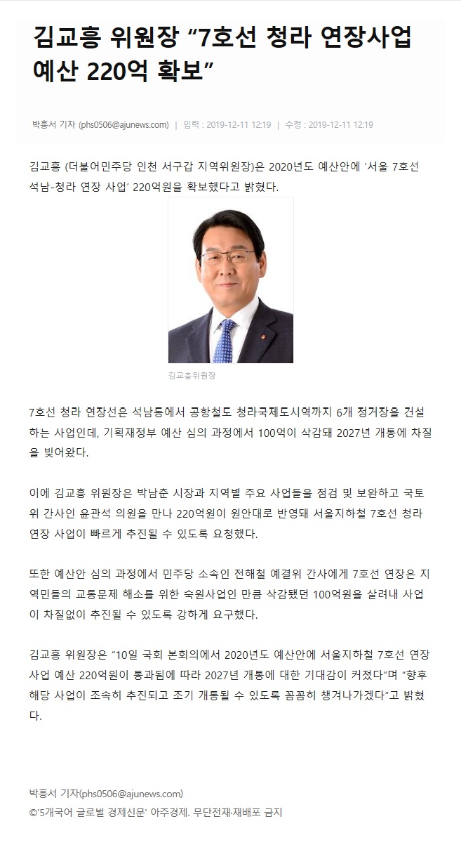 ±è±³Èï À§¿øÀå ¡°7È£¼± û¶ó ¿¬Àå»ç¾÷ ¿¹»ê 220¾ï È®º¸¡±